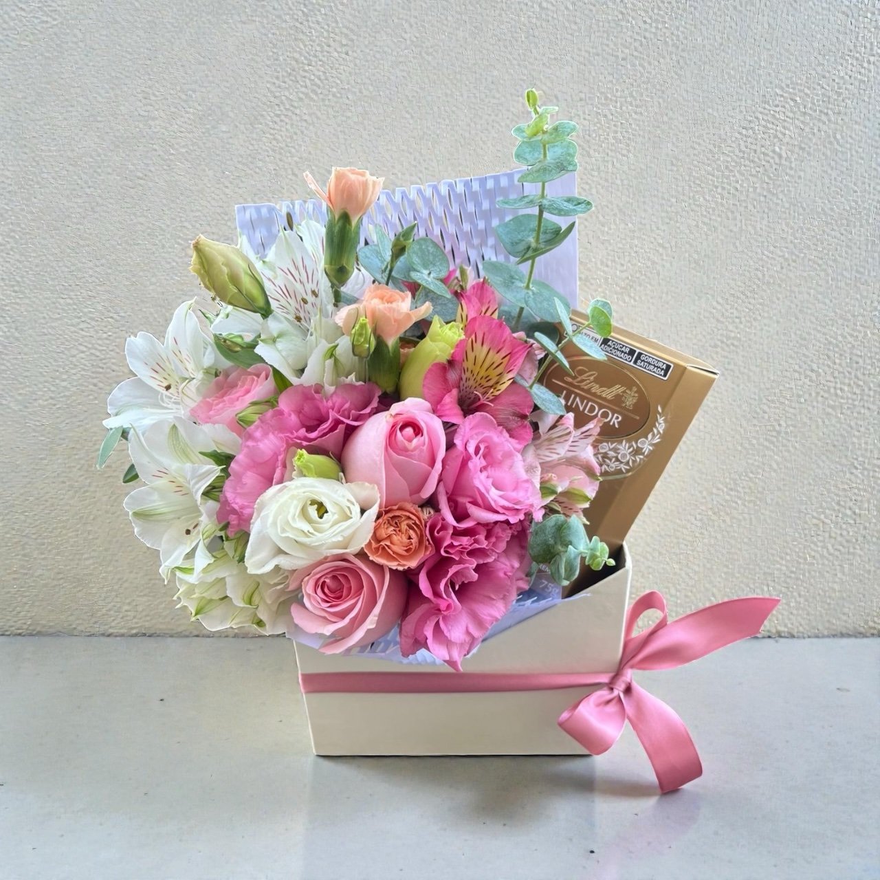 Acompanha flores claras e um chocolate de 75 gramas sortidos!