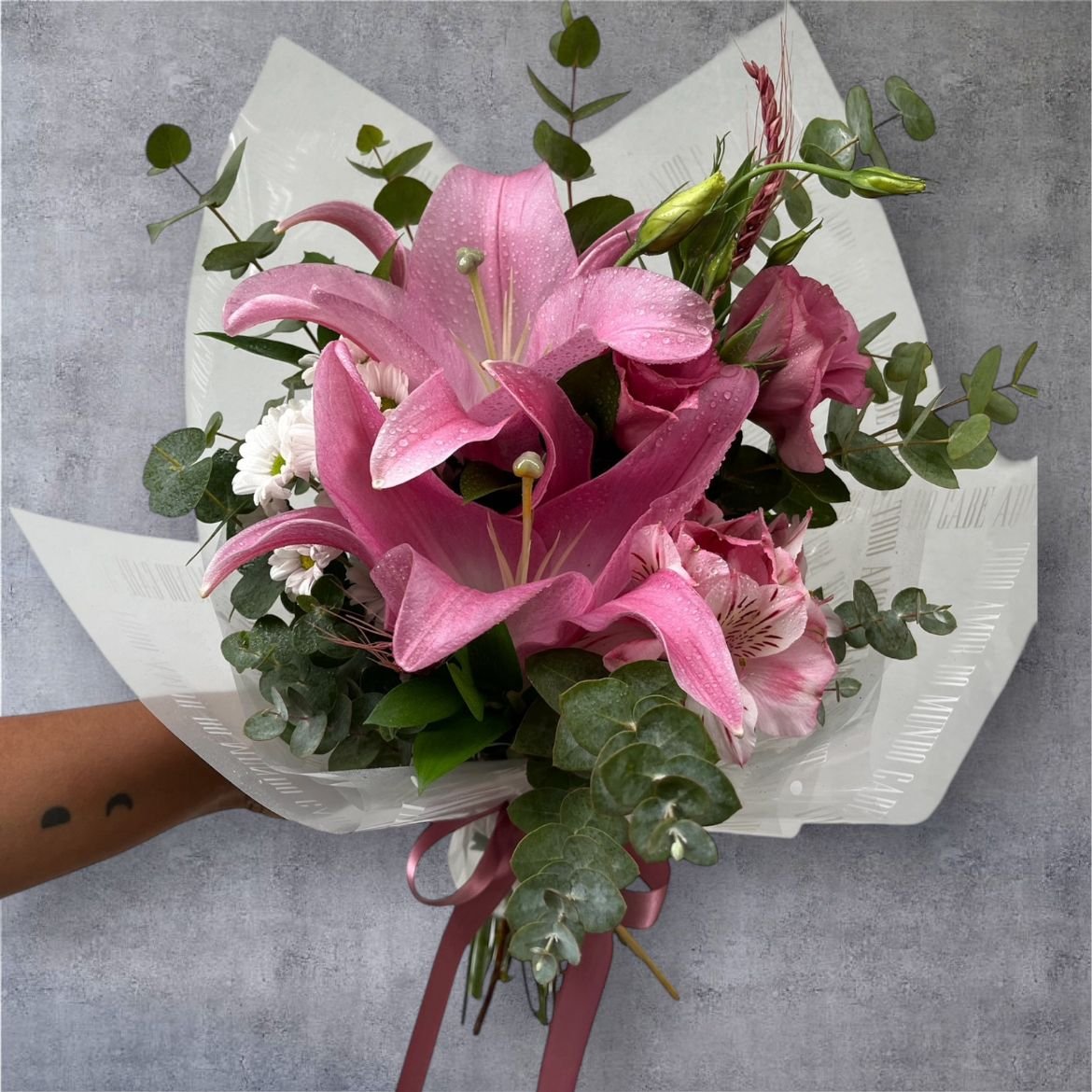 Foto inspiração, com laço de cetim e embalagem de buquê.