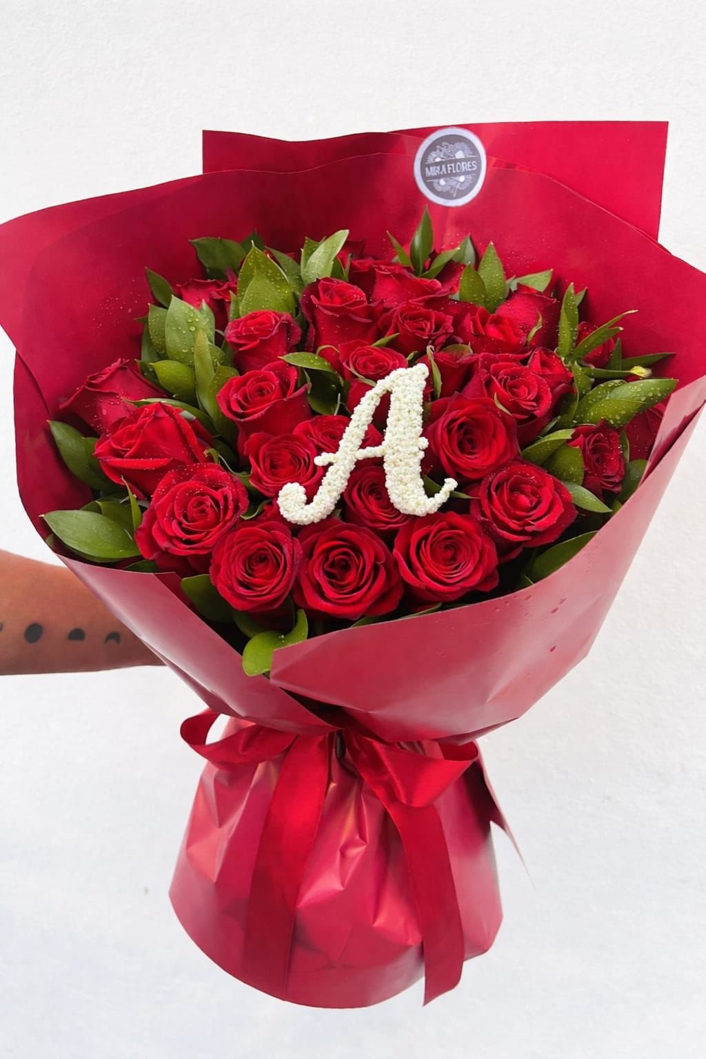 Buquê de 30 rosas vermelhas e letra inicial do nome de quem recebe as floresComposto por 30 Rosas vermelhas, e verdes complementares.
